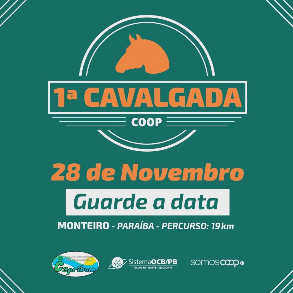 Vem aí a 1ª Cavalgada Coop! Promovido pela Cooperativa dos Produtores Rurais de Monteiro (Capribom) em parceria com o Sistema OCB/PB, o evento será realizado no dia 28 de novembro, a partir das 8h. Os cavaleiros vão realizar um percurso de 19km, pelos arredores do em uma o...